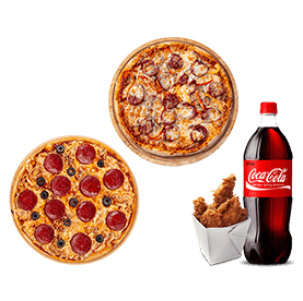 2 Pizzas familiale au choix + 8 Chicken wings + 1 Maxi coca cola 1.25l.