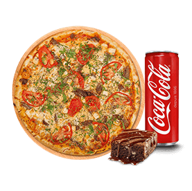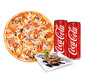 1 Pizza sénior au choix + 1 Dessert au choix(tartelette aux pommes ou tarte flan ou brownie) + 2 Coca cola 33cl.